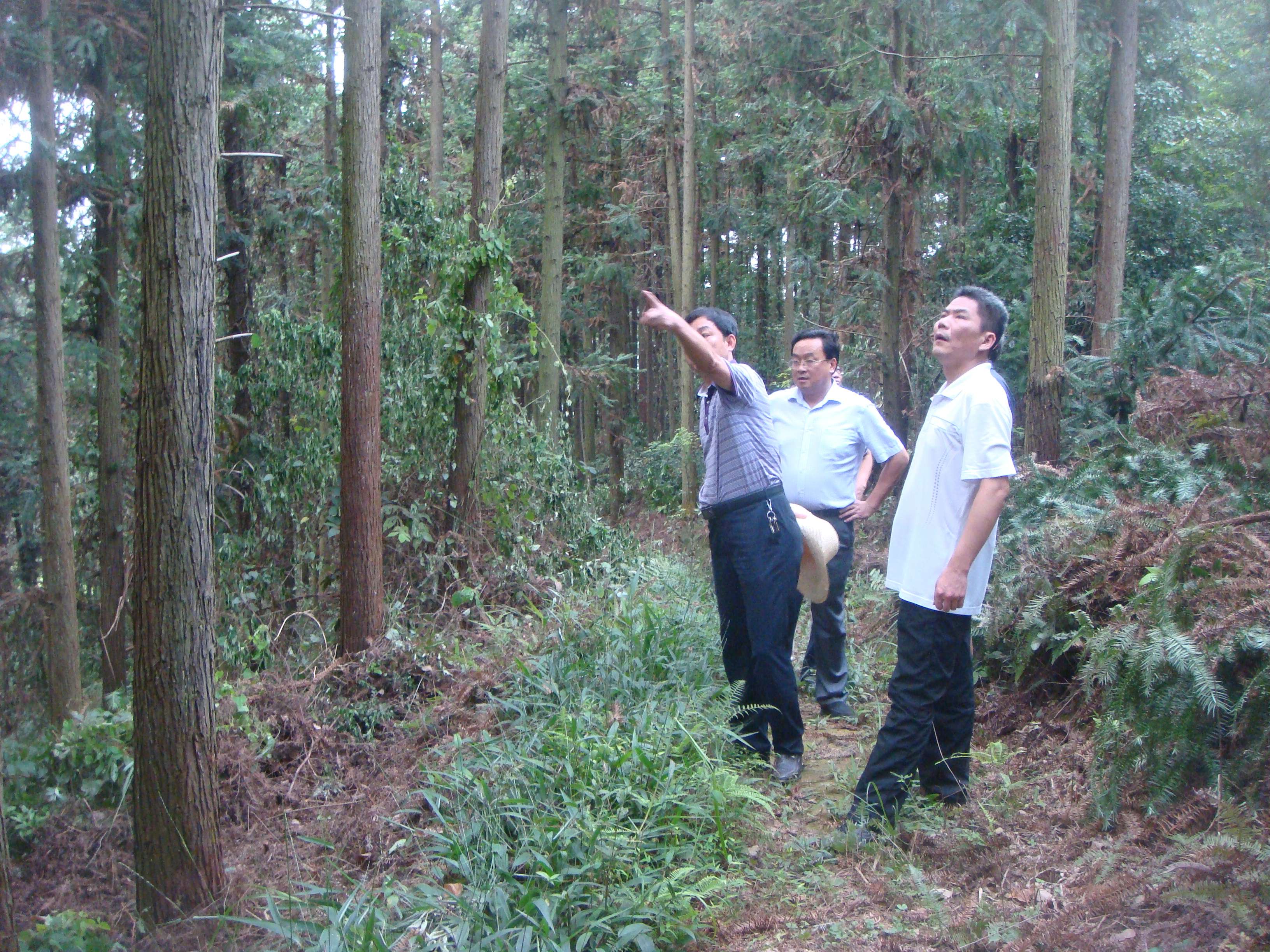 7月16日,吉安市林业局局长黄春就杉木大径材培育到我场进行工作调研。图为:场党委书记聂煜、场长刘晖陪同黄春局长实地察看东毛坑分场洋丰坳杉木大经材示范林。